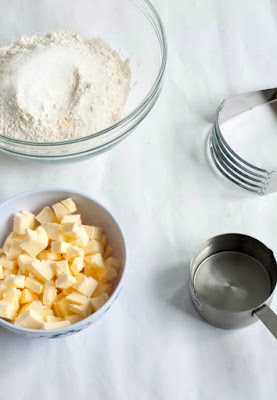 Colocar a farinha numa taça, juntamente com o sal, o açúcar. Misturar e de seguida juntar os cubos de manteiga bem fria. Com a ajuda de um "pastry blender", misturar a farinha e a manteiga, de modo a obter pedacinhos de manteiga do tamanho de ervilhas. (esta operação pode ser feita num processador de alimentos)